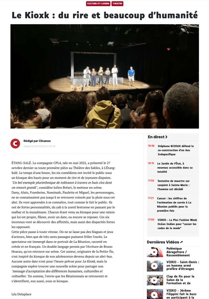 La Compagnie CPL4 présente la pièce de théâtre « Le Kioxk » écrite par Bruno Hoarau et mise en scène par Julien Breart qui traite du thème de l’acceptation des différences individuelles et culturelles à travers l’humanisme, la tragédie, la comédie et l’optimisme.
